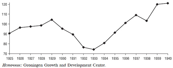 Началом Великой депрессии в США принято считать август 1929 года, когда индекс промышленного производства достиг своего пика. Последующая динамика как промышленного производства, так и национального продукта в целом была отрицательной до начала 1934 года. Рис. 1 показывает динамику ВНП США в постоянных ценах 1929 года, из которого видно, что ВНП падал на протяжении четырех лет и, возобновив рост, достиг уровня 1929 года только в 1937 году. Хотя график и имеет V-образную форму, глубина падения (29% от пика) и продолжительность восстановления до предкризисного уровня (8 лет) говорят об очень большой потере благосостояния многих экономических субъектов того времени.