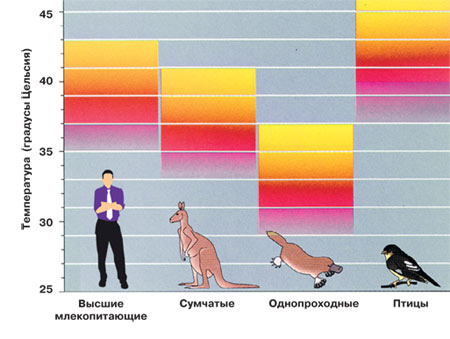 Температура тела у разных животных. Красным показаны пределы нормы, жёлтым — летальная температура.