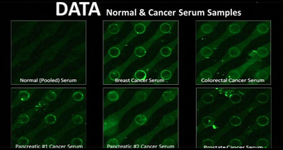 Новый микрочип от Biological Dynamics может отделить биомаркеры раковой опухоли. Слева вверху кровь без признаков рака, остальные образцы содержат маркеры различных типов рака