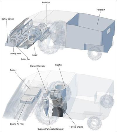 Устройство газонокосилки EcoMow: спереди расположены ножи, шнек и сушилка. В центре – газогенератор и одноцилиндровый электрогенератор, работающий на газу