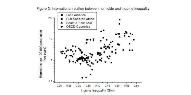 Согласно исследованию профессора Нотингемского университета Ричарда Уилкинсона, рост количества убийств на 100 тыс. человек зависит от равномерности распределения доходов. Чем больше разрыв между богатыми и бедными, тем больше насилия затопляет дома и улицы.