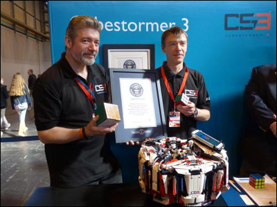 Робот Cubestormer 3, собранный кембриджскими инженерами и управляемый смартфоном, поставил мировой рекорд по скорости сборки Кубика Рубика. Инженеры Майк Добсон и Дэвид Гилдей в свое свободное время строили робота, который мог бы побить рекорд по скорости сборки Кубика Рубика своим же роботом - Cubestormer 2, который в 2011 году собрал головоломку за 5,27 секунды. За 18 месяцев инженерам удалось создать робота, который улучшил рекорд на целых 2 секунды.