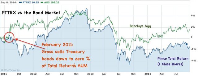Оглядываясь назад, становится ясно, что первая серьезная трещина в "корабле" PIMCO образовалась в 2011 г., когда Билл Гросс публично объявил о своей новой большой ставке на падение трежерис. Он намеревался свести долю казначейских бумаг в портфеле до нуля. При этом в декабре предыдущего года доля трежерис составляла 22% вложений фонда. Это было слишком радикальное изменение позиции для такого крупного фонда. Гросс начал публично призывать инвесторов избавляться от трежерис, называя их "грабежом инвесторов" за слишком низкую доходность. В итоге рынок пошел против него. Сложно сохранять самообладание в такой ситуации, когда твои публичные заявления оказываются ошибочными и наносится такой удар по авторитету.