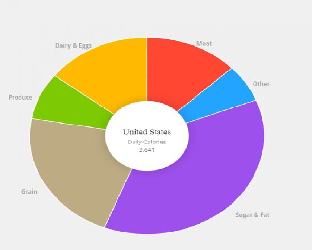В 2011 г. количество еды в США на человека в день составляло приблизительно 3 641 калорию в среднем. (Примечание. Здесь имеются в виду пищевые ресурсы, то есть количество еды, которое доступно на человека: не вся эта еды съедается, часть ее выбрасывается.)