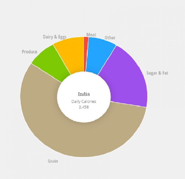 Индия по-прежнему более бедная страна, чем Китай, в расчете на человека, и это отражается на рационе. Пищевые запасы Индии составляют около 2 458 калорий в день на человека, что значительно меньше, чем в США и Китае.