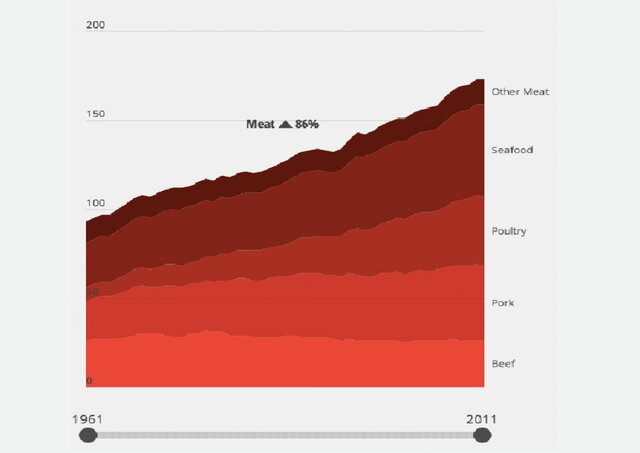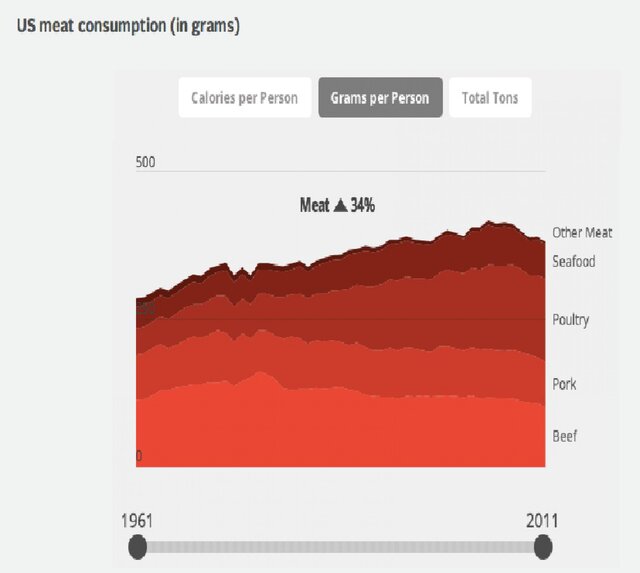 В 1961 г. потребление мяса составляло около 93 грамма на человека в день. К 2011 г. это значение увеличилось до 171 грамма на человека в день. Особенно выросло потребление мяса птицы и морепродуктов. Тем не менее средний уровень потребления говядины остался приблизительно на том же уровне.