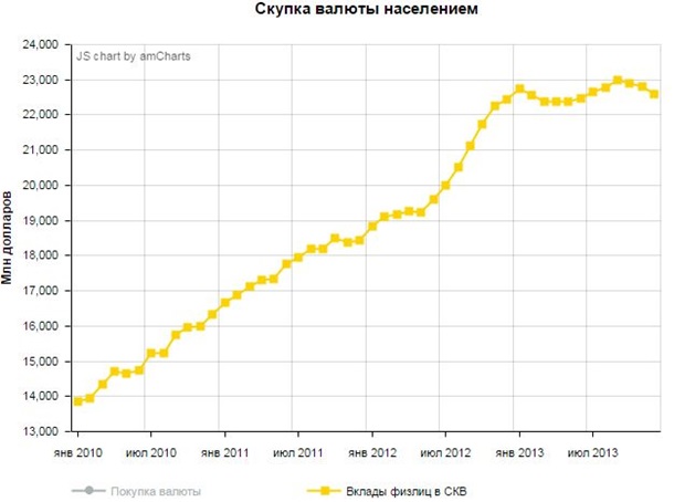 Для этого, в частности, было принято решение поднять коммерческим банкам ставки обязательного резервирования под валютные депозиты, что помогло существенно снизить их привлекательность и стимулировало население хранить свои сбережения в гривне. Под конец 2013 года доля валютных депозитов снизилась ниже уровня в 40% от общего объема, хотя еще в 2008-2009 годах соотношение валютных и гривневых депозитов оценивалось как 60/40. Уже к осени 2013 года прирост вкладов населения примерно на 90% обеспечивался именно гривневыми вкладами. Увеличение же привлекательности гривневых сбережений способствовало поддержанию низкого спроса на доллар со стороны населения.