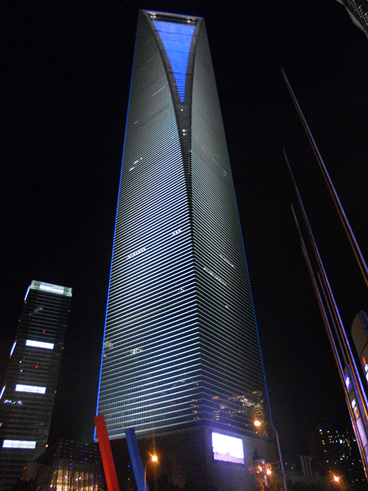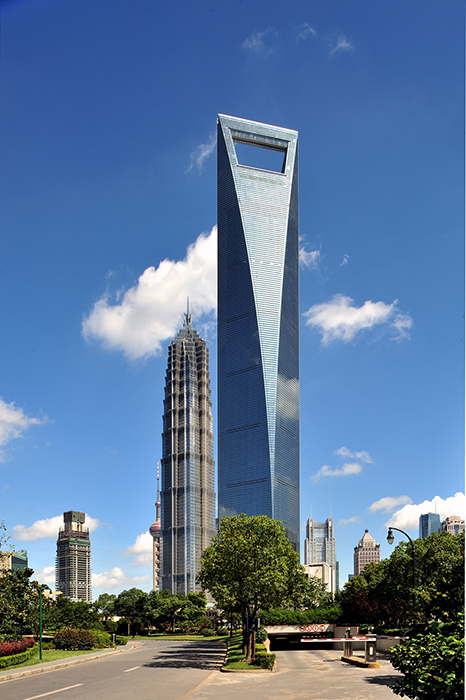 Строительство шестого по высоте здания мира было завершено в 2008 году. Особенности китайского ландшафта вынудили главного архитектора Дафида Малотта создать конструктивную систему, способную выдержать землетрясение до 7 баллов. В состав 101-этажного гиганта входят всевозможные магазины, рестораны, конференц-залы, офисы различных компаний и самая высокая смотровая площадка, расположенная на 100 этаже. Неофициальное название комплекса - "открывашка".