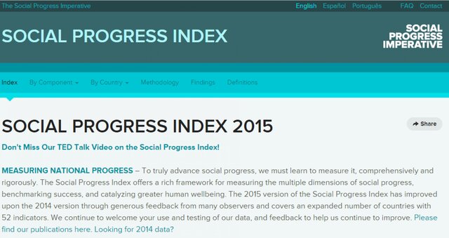 Недостатки использования одного только параметра ВВП стали хорошо видны благодаря индексу социального прогресса 2015, опубликованному 9 апреля. Этот индекс, созданный в сотрудничестве со Скоттом Стерном из Массачусетского технологического института и с некоммерческой организацией Social Progress Imperative, показывает успехи 133 стран в различных аспектах социального и экологического развития. Это наиболее полная, фундаментальная работа, позволяющая измерить социальный прогресс, и первая, в которой социальный прогресс измеряется независимо от ВВП.