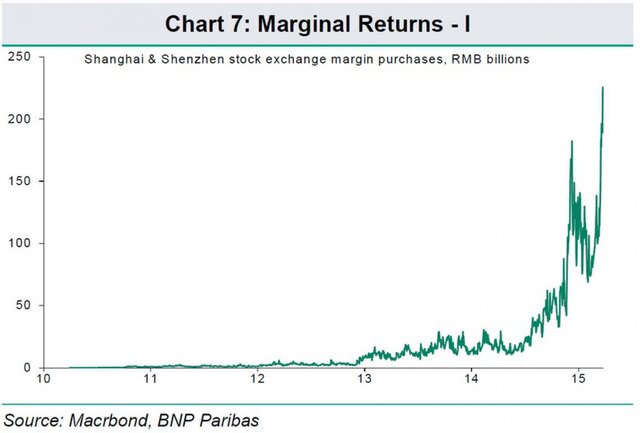 Подводя итог, стоит отметить, что в Китае в биржевую игру вовлечено огромное количество людей, и это число увеличивается примерно на 1,6 млн в неделю. Активность этих людей уже привела к проблемам с передачей данных по объемам торгов на Шанхайской фондовой бирже. Более того, большинство из них активно прибегают к использованию финансового плеча, проще говоря, к маржинальной торговле. Именно этот факт делает рост китайского фондового рынка крайне неустойчивым. График ниже говорит сам за себя.