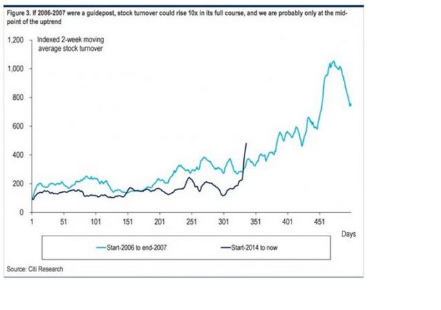 Впрочем, эксперты Citi полагают, что пока фондовая мания еще не достигла своего пика и мы находимся только где-то в середине пути. Они считают, что, несмотря на рекордные объемы торгов в абсолютном выражении, которые выросли в 10 раз, в относительном выражении в сравнении с периодом 2006-2007 гг. рост оказался всего пятикратным.