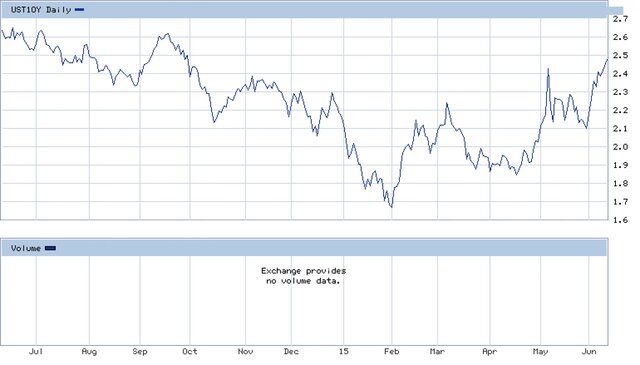 Компания CRT Capital опросила 50 финансовых институтов, работающих на рынке процентных ставок и казначейских облигаций, и выяснила, что к августу участники рынка прогнозируют доходность по десятилетним трежерис на уровне 2,57%. Напомним, что в сентябре состоится заседание ФРС, на котором может быть принято решение о повышении ставки. Прогнозы на ноябрь выглядят еще более интересно - 2,8%.