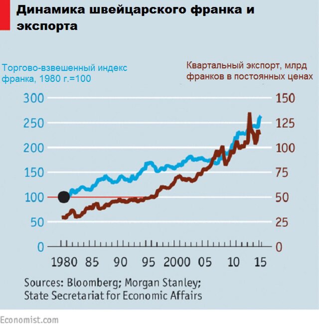 Однако в Швейцарии "в итоге" может произойти неизвестно когда в будущем. За последние 30 лет взвешенный курс франка увеличился на 130%, а экспорт взлетел на 200% с учетом инфляции.