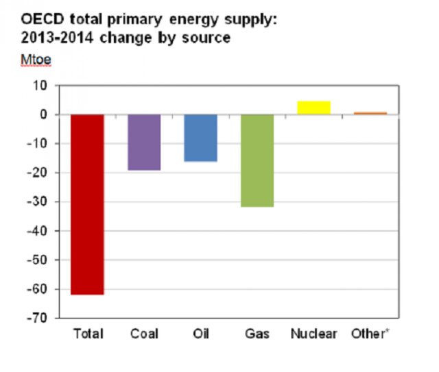 Общие запасы первичной энергии (TPES), индикатор использования энергии, снизился во всех странах ОЭСР на 1,2%, в основном за счет снижения всех видов горючих ископаемых: потребление газа снизилось на 2,3%, угля – на 1,9%, нефти – на 0,9%.