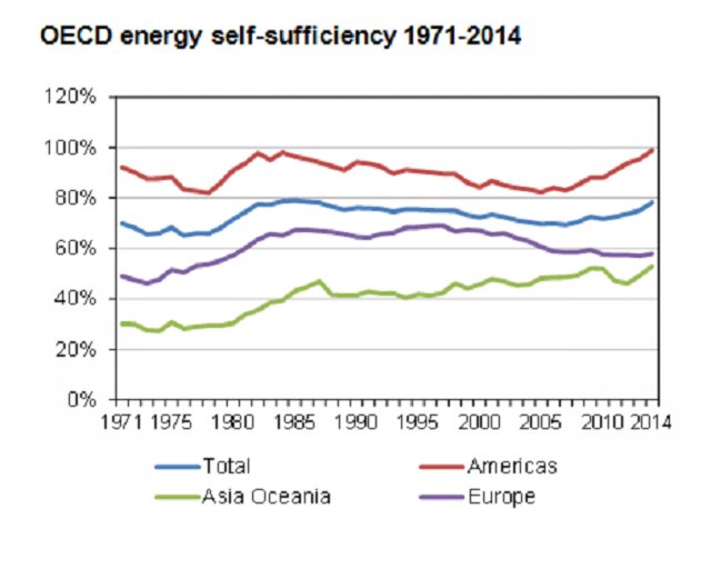 По мере того как производство увеличилось больше, чем использование, общий уровень энергетической независимости (которая определяется как соотношение производства к TPES) вырос до 78% в 2014 г. по сравнению с уровнем 1985 г. Американские страны-члены ОЭСР были наиболее близки к полной энергетической независимости - 99%, это самый высокий показатель с момента основания МЭА.