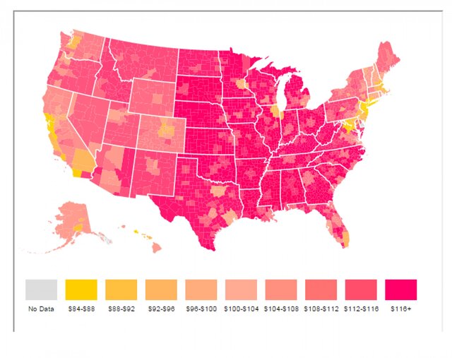 Согласно последнему отчету Bureau of Economic Analysis от 2013 г. стоимость жизни там намного ниже. Жители Миссисипи, например, могут купить на $  100 больше, чем жители любого другого штата, - $  115,21. Следом идет Южная Дакота, где 0 оценивается в 4,16. Ну и завершает тройку штат Огайо, где покупательная способность $  100 оценивается в $  111,6. Действительно, разброс по штатам очень существенный, что наглядно отражает карта, которую мы приведем ниже.