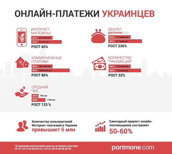 В текущем году, несмотря на сложную экономическую ситуацию в стране, цифры не менее внушительные. Рост в первом полугодии 2015 по сравнению с аналогичным периодом прошлого года, когда объем операций был 1,1 млрд гривен, составил 236 %. При этом пользователи потратили на 65% больше денег на покупки в интернет-магазинах (33,3 млн гривен в первом полугодии 2014-го в сравнении с 55 млн гривен в первом полугодии 2015-го), а интернет-платежи за коммуналку увеличились со 165 млн гривен до 306,8 млн гривен (86%).