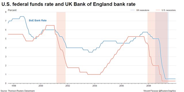 Последний раз Федрезерв повышал ставку в далеком 2006 г., а Банк Англии делал это в 2007 г. И это вовсе не случайность, что британский регулятор сделал свой шаг позже. Если посмотреть историю, то практически всегда Банк Англии следует за ФРС, а не наоборот. Так что в данном случае ориентироваться лучше на американцев. Кстати, на эту тему буквально на днях писало агентство Reuters. В материале говорится, что Банк Англии только изображает независимость, а на самом деле следует за Федеральной резервной системой. Ну и, конечно, ничего не может быть более наглядным, чем факты. Ниже приведем график, на котором видно, что Банк Англии действительно никогда не принимает решение первым.