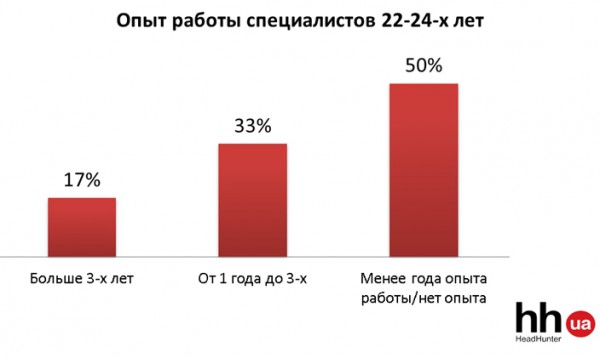 Несмотря на то, что половина молодых людей еще только начинают свой путь по карьерной лестнице, треть ровесников независимости уже успели поработать от одного до трех лет. Особо трудолюбивые и настойчивые могут похвастаться и четырехлетним опытом работы. Однако таких соискателей только 17%.