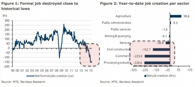 Также на 12% падает импорт, а реал обесценился с начала года примерно на 25%. Не стоит забывать, что многие бразильские компании активно кредитовались в долларах и теперь обслуживание этих кредитов обходится им намного дороже. С другой стороны, ослабление валюты может помочь экономике, тем более что сейчас сложно найти страну, которая не участвует в гонке девальваций. Однако по сравнению с прошлым годом экспорт вырос всего на 7%, и эксперты считают, что одним экспортом ситуацию не исправить и рецессия продлится еще как минимум год.