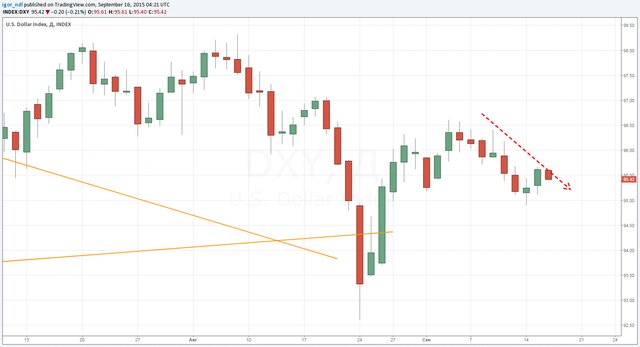 Ситуация в преддверии важнейшего решения складывается крайне запутанная. Фьючерсы на ставку оценивают вероятность повышения на этом заседании всего в 30%, хотя еще месяц назад она находилась на отметке почти 50%. То есть в повышение ставки особо никто не верит, да и доллар тоже в последние две недели не растет, а, наоборот, снижается.