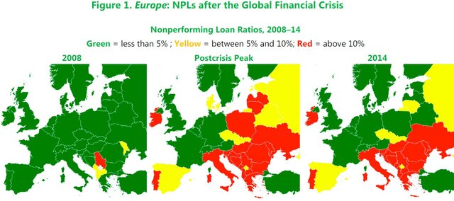 "Семь лет спустя с начала глобального финансового кризиса в большинстве стран Европы сохраняются повышенные уровни проблемных активов. В ряде европейских стран, в особенности в южной части еврозоны, а также в восточной и юго-восточной частях Европы, объем "плохих" активов остается высоким и в некоторых странах продолжает расти. К концу 2014 г. доля проблемных активов в общем объеме кредитных портфелей банков в ряде стран превысила 10%. Особенно высокие уровни показатели проблемных активов отмечены в таких странах, как Кипр (более 40%) и Греция (35%). В 16 банках из 8 различных стран Европы по состоянию на конец 2014 г. доля "плохих" активов составляли 30% и выше.