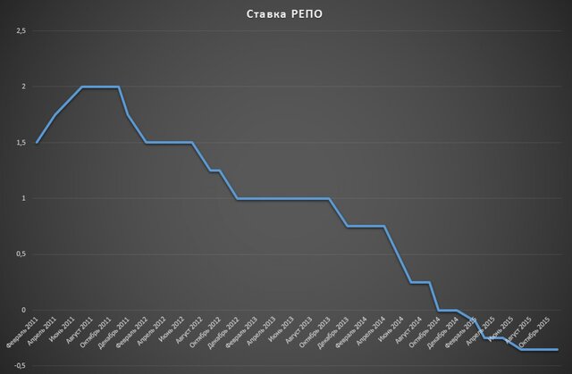 Центробанк сохранил размер процентной ставки по 7-дневным операциям РЕПО на уровне минус 0,35% в соответствии с прогнозом большинства опрошенных Bloomberg экспертов.