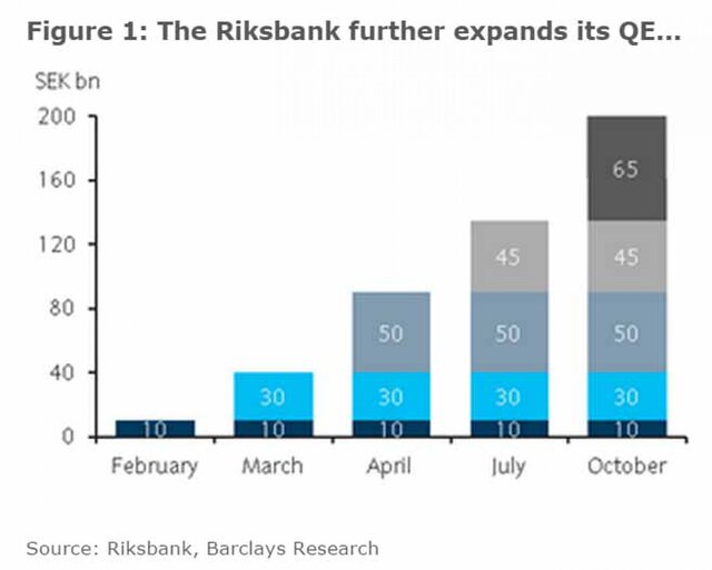 C февраля по октябрь Riksbank 5 раз увеличивал объемы программы, которые выросли с 10 млрд шведских крон ($ 1,18 млрд) до 200 млрд шведских крон ($ 23,53 млрд).