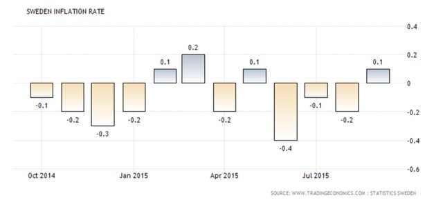 ЦБ Швеции безуспешно пытается вернуть инфляцию к целевому показателю в 2%. Инфляция в стране не поднималась до этого уровня с конца 2010 г., поскольку укрепление кроны относительно других мировых валют толкает вниз стоимость импорта. Инфляция в сентябре составила 0,1%.