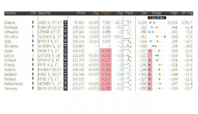 В общем и целом, в Европе началась очередная монетарная паника, и ничто и никто не может проиллюстрировать это лучше, чем долговой рынок. Короткий конец кривой доходностей европейских стран испытывает мощнейшее давление: более чем у половины стран доходность по двухлеткам уже находится на отрицательной территории. Более того, во многих случаях показатель не просто находится ниже нуля, но и устанавливает исторические рекорды. Ниже приведем таблицу, где красным выделены бумаги с отрицательной доходностью, а в левом столбце - эмитенты.