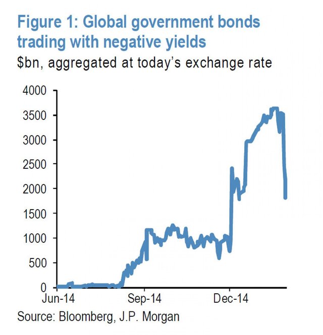 Отрицательные ставки сейчас можно встретить далеко не только в еврозоне или Европе, благо центробанков, заливающих рынки свежими деньгами, предостаточно. Аналитики банка JP Morgan провели расчеты и выяснили, что сейчас в мире с отрицательной доходностью торгуются облигации на колоссальную сумму в ,6 трлн, а это 16% от JPM Global Government Bond Index. Иными словами, почти пятая часть всех мировых бондов торгуется с отрицательной доходностью, а значит, инвесторы приплачивают эмитенту за возможность дать в долг.