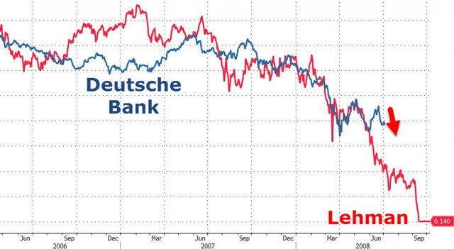 Ну и, конечно, как тут не вспомнить историю с крупнейшим банком Германии, который испытывает очень серьезные проблемы, а динамика его акций очень сильно напоминает Lehman Brothers.