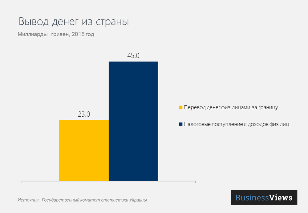 Когда ты платишь тысячу гривен налога, кто-то выводит из Украины 500 — приблизительно так в прошлом году соотносились суммы, которые физические лица перечислили в бюджет и которые перевели за границу. Из Украины вывели 23 миллиарда долларов — это больше, чем все кредиты от МВФ в 2015 году.