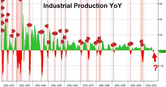 Промышленное производство в США снижается уже десятый месяц подряд, и это самый затяжной спад, который когда-либо случался без рецессии. Поддерживает экономический рост лишь сектор услуг, однако долго это продолжаться не может, во всяком случае об этом говорит история наблюдений.
