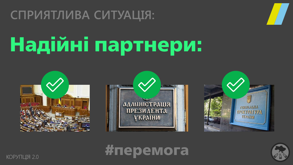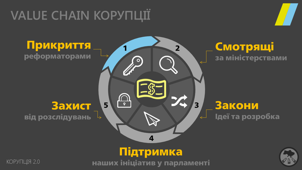 Именно эти четыре элемента вместе и образуют ситуацию, с которой в Украине вроде как пытаются бороться. Первым делом лозунги призывают наказать виновных. Потом — пресечь попытки чиновников украсть.