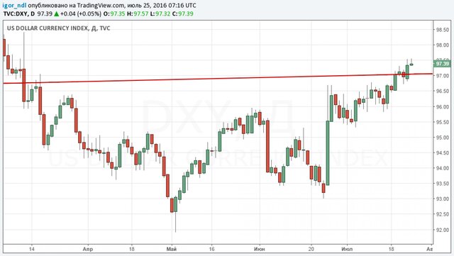 Индекс американской валюты к корзине шести основных валют демонстрирует уверенный рост с конца июня, когда прошел референдум по выходу Великобритании из ЕС.