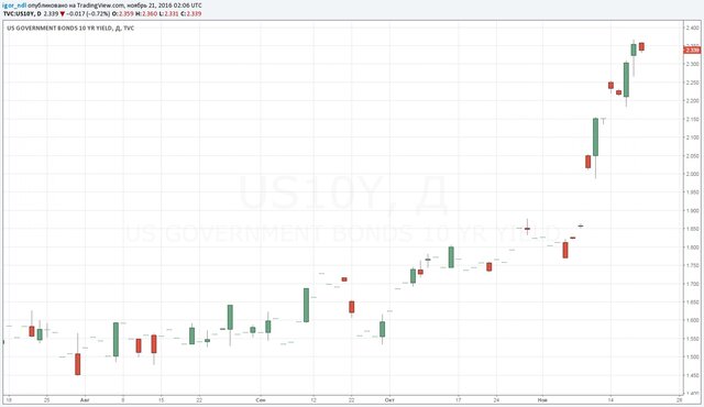 Неожиданная победа Трампа буквально парализовала торговлю, и инвесторы начали сбрасывать облигации. Согласно данным Bloomberg доходности трежерис отклонились от модели, основанной на справедливой цене.