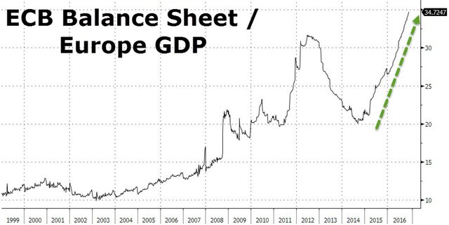 Но самое интересное заключается вовсе не в том, какие бумаги, с каким рейтингом и дюрацией покупает ЕЦБ, а то, насколько масштабна роль регулятора на долговом рынке. Общий баланс ЕЦБ с момента последнего обновления вырос на 21 млрд евро и достиг 3,631 трлн евро, а эта сумму эквивалентна 35% ВВП всей еврозоны.