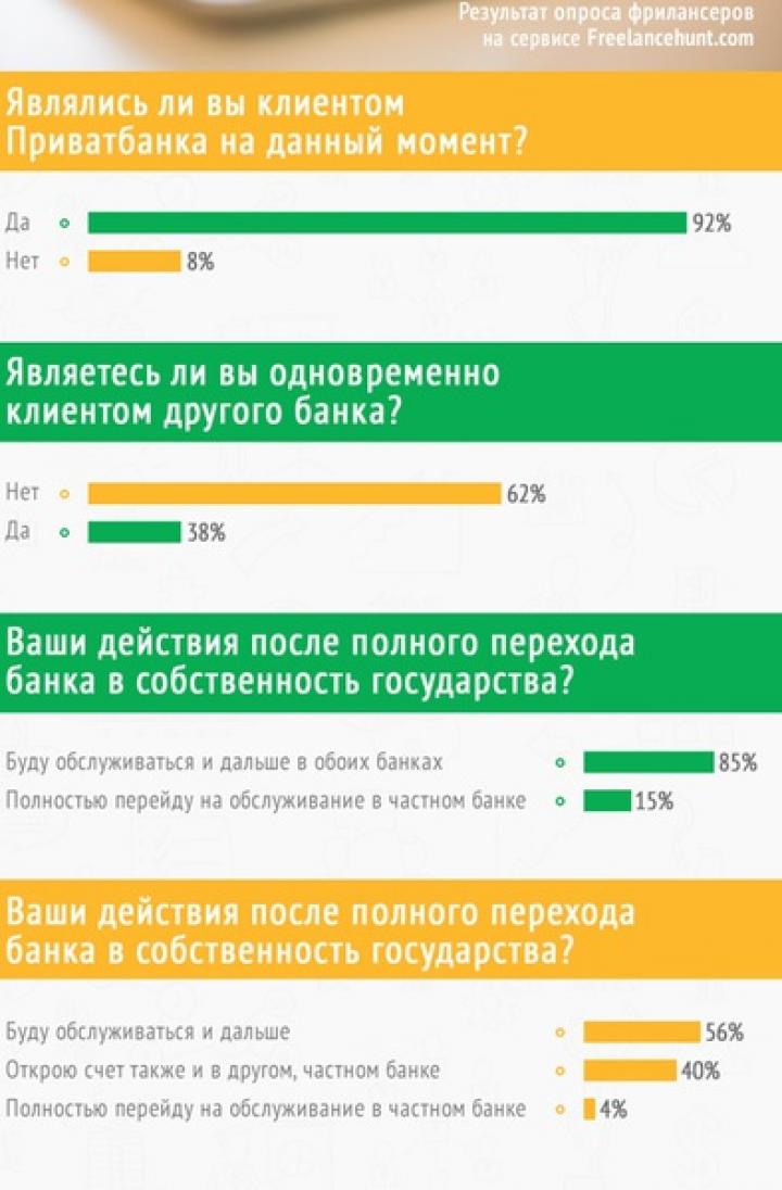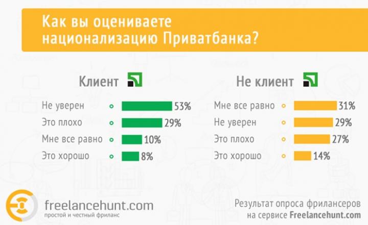 Как показало исследование, клиентами Приватбанка являются 92% фрилансеров. Одновременно, 62% из них обслуживаются как минимум еще в одном, частном, банке. 53% клиентов Приватбанка не уверены, национализация для банка — это хорошо или плохо. 29% считают, что это плохо, и лишь 8% настроены позитивно и считают, что данное решение государства правильное.