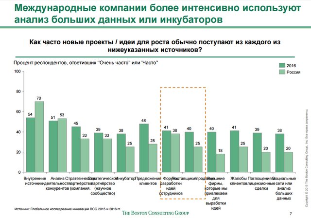 "С учетом увеличивающегося темпа рыночных изменений и того факта, что даже в более традиционных секторах технологии становятся ключевым фактором, отношение к внешним изобретениям, как к "чужим", может оказаться фатальным, — считает партнер BCG и соавтор отчета Эндрю Тэйлор. — Сегодня самые успешные новаторы находят стратегический баланс между внутренними и внешними инновациями. Они проявляют мудрость и эффективность в поиске и сканировании внешних идей и действуют молниеносно, внедряя их в своих компаниях".