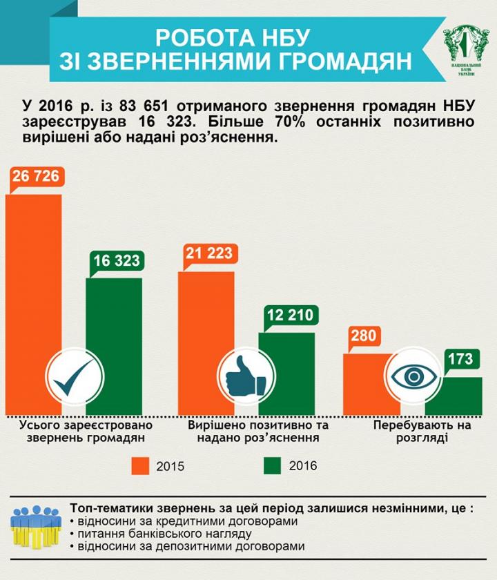 В 2016 году количество обращений граждан в Национальный банк Украины сократилось: центральный банк получил 83 651 обращение, что на 5318 обращений (или 5,98%) меньше, чем за 2015 год.