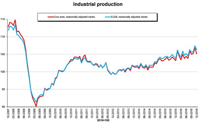 ЕС. Объем промышленного производства в еврозоне сократился на 1,6% в декабре 2016 г.