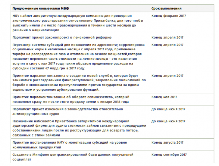 По обновленной версии, до конца апреля Украина обязуется принять закон о комплексной пенсионной реформе, которая вступит в силу с января 2018 года.