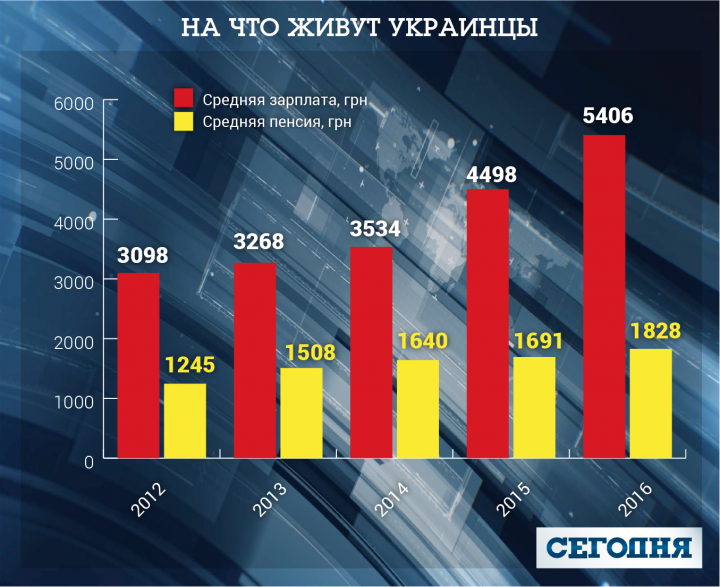 Согласно данным официальной статистики, за шесть лет средняя зарплата в Украине выросла с 3098 до 5406 гривен. В то же время средняя пенсия в Украине с 2012-го выросла с 1245 до 1828 гривен.