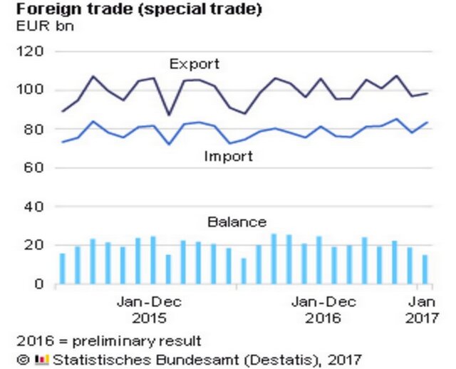 Экспорт из Германии в страны ЕС вырос на 8% относительно января 2016 г. до €58,8 млрд, в том числе экспорт в страны еврозоны увеличился на 8,4% до €37,1 млрд. Экспорт в третьи страны в январе вырос на 17,7% в годовом выражении до €40,1 млрд.