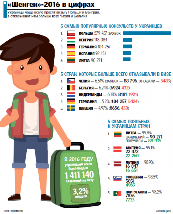 Если сравнивать с 2015-м, то число украинцев, которые хотели оформить “шенген” в прошлом году, выросло почти на 13%. Два года назад его пытались получить 1,2 млн человек, в 2016-м это количество увеличилось до 1,4 млн. Соответственно, выросло абсолютное число отказов — с 40 до 45 тыс. человек. Но эта неприятная статистика перекрывается общими цифрами: сегодня можно, наоборот, говорить об увеличении количества тех, кто все же получил шенгенскую визу, — на 180 тыс. человек.
