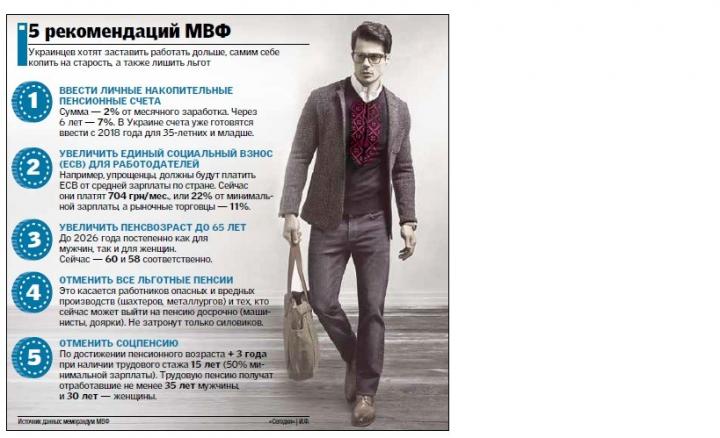 Как видно из инфографики, уменьшить расходы из казны на пенсионеров МВФ советует за счет увеличения пенсвозраста (в меморандуме этого требования нет) и повышения налогового бремени на упрощенцев. А также предлагает отнять право на досрочный выход на пенсию у представителей вредных и опасных профессий, отменить соцпенсии для тех, кто не имеет трудового стажа в 35 лет (для женщин — 30 лет). “Это рекомендации, но их игнорирование может повлиять на дальнейшее сотрудничество с МВФ”, — говорит Охрименко.