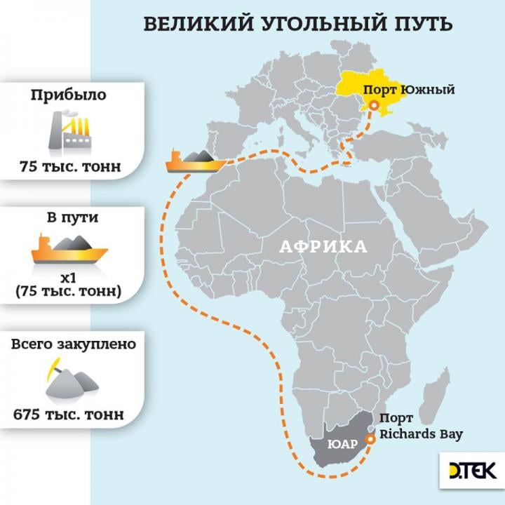 “Второе судно с ЮАРовским антрацитом проходит сейчас Гибралтарский пролив. А значит, что совсем скоро в Украину будет доставлена новая партия угля для теплоэлектростанций ДТЭК, чтобы они могли и дальше обеспечивать стабильность энергосистемы”, – сообщают в компании.