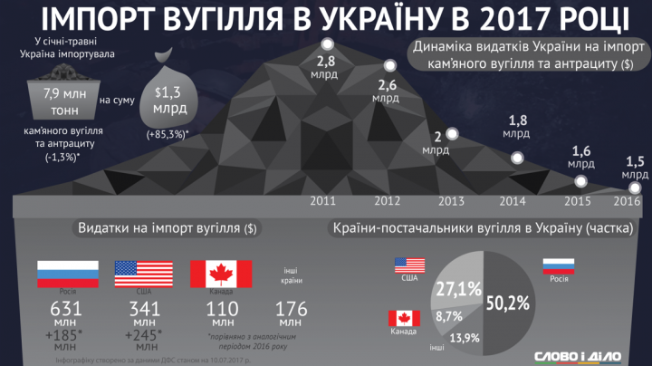 По словам аналитиков издательства “Слово и дело”, самыми большими затраты на уголь были еще при Януковиче – в 2011 году, когда Украина вполне контролировала всю свою территорию. Тогда на его покупку в год уходило порядка 2,8 миллиарда долларов.