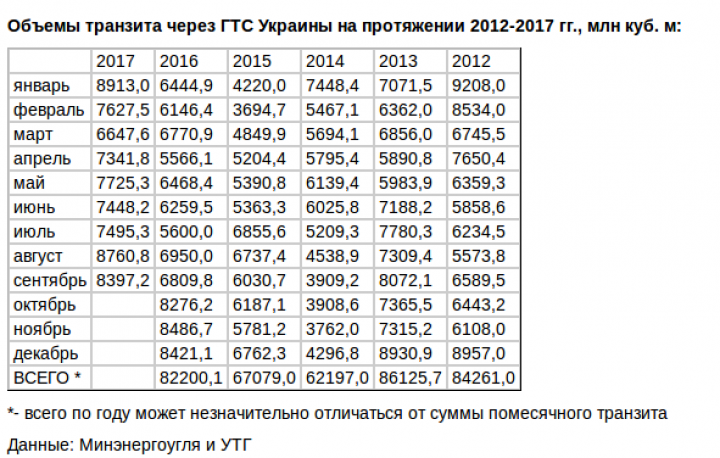 Согласно оперативным данным ПАО “Укртрансгаз”, в том числе транзит газа через Украину в Европу за девять месяцев составил 68 млрд 541,7 млн куб. м, в Молдову – 1,815 млрд куб. м.